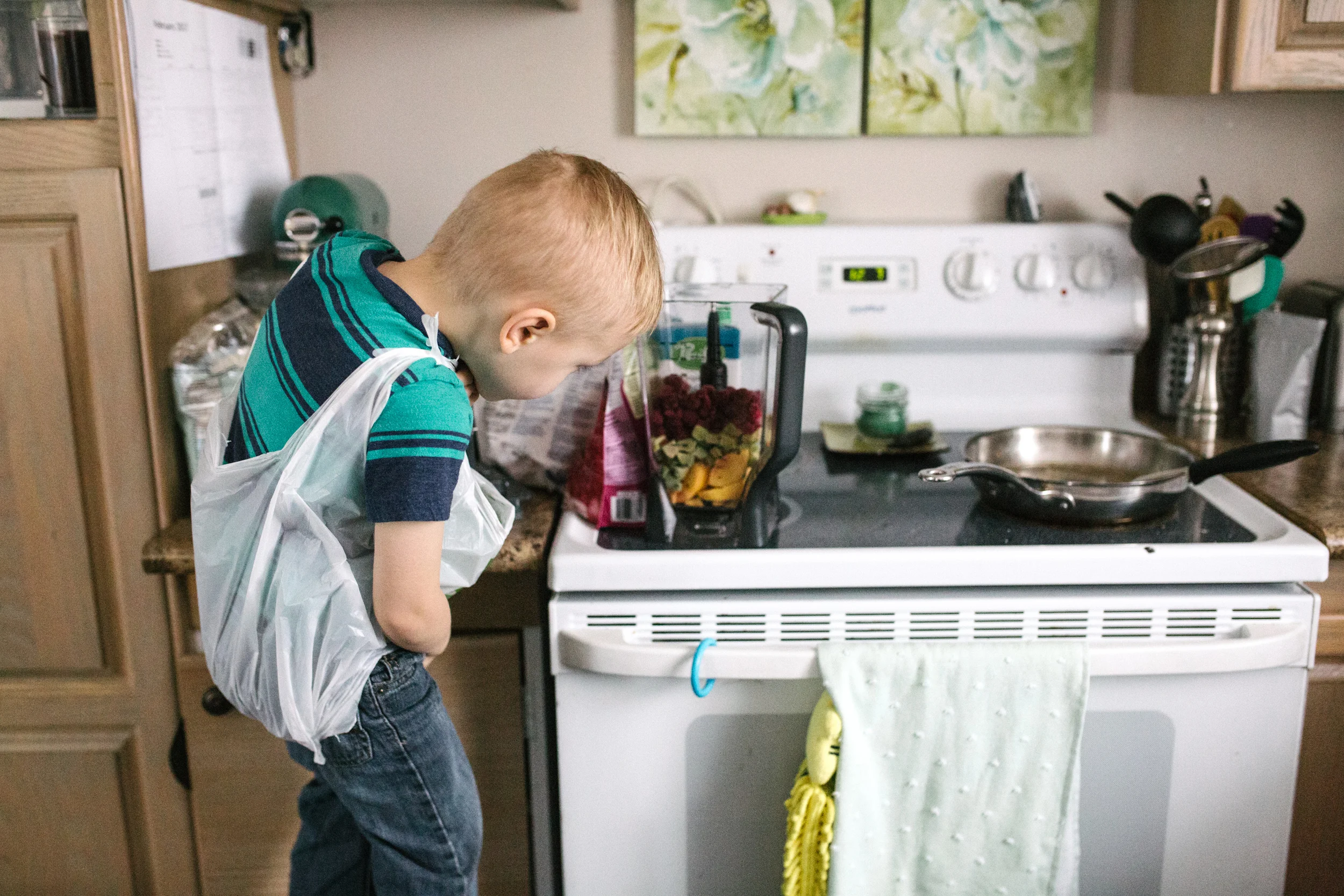 We then headed to church (I was volunteering in the church nursery this week), then grabbed a few groceries on our way home. Bo helped me make some smoothies for lunch, with his new designer outfit from the "N and O store", haha.